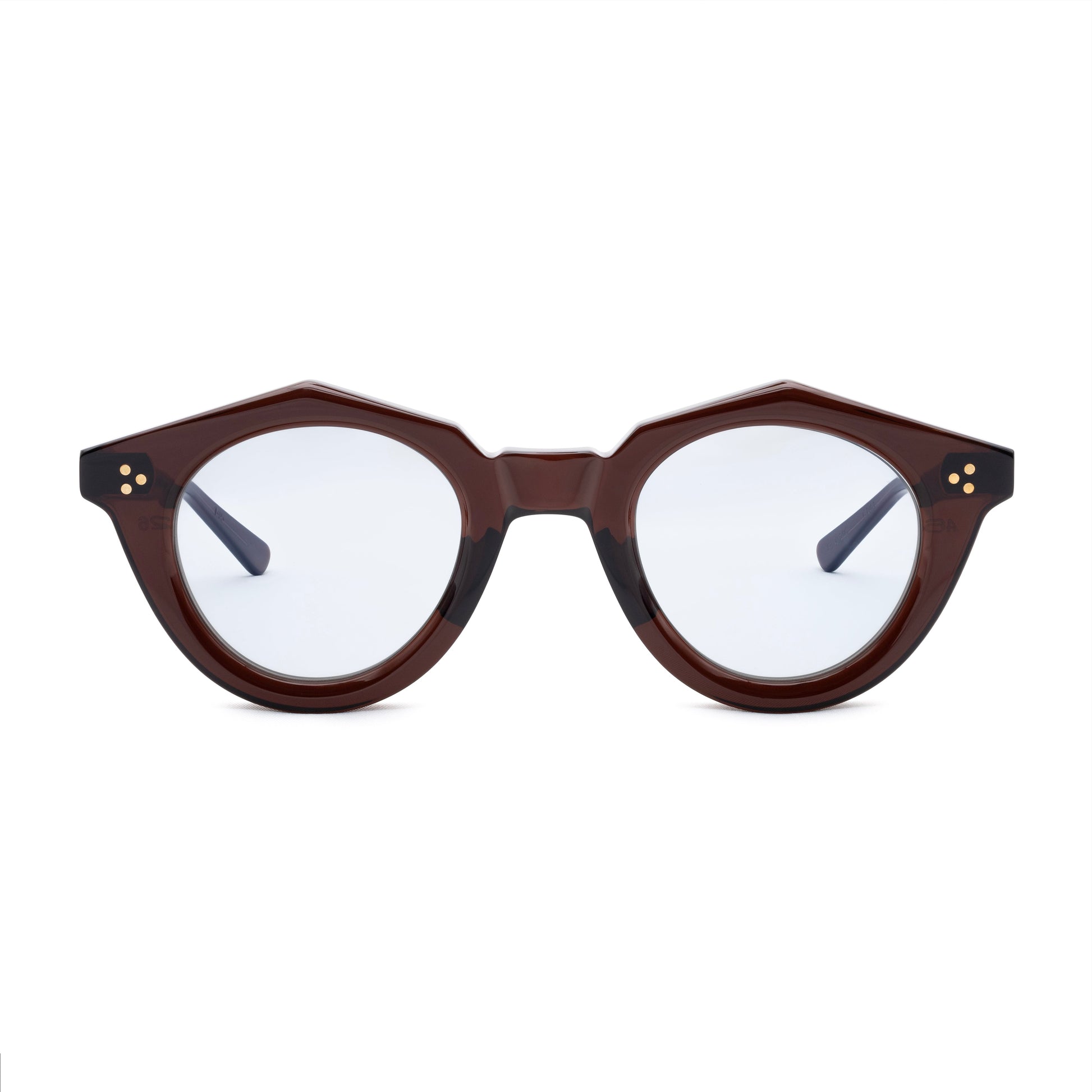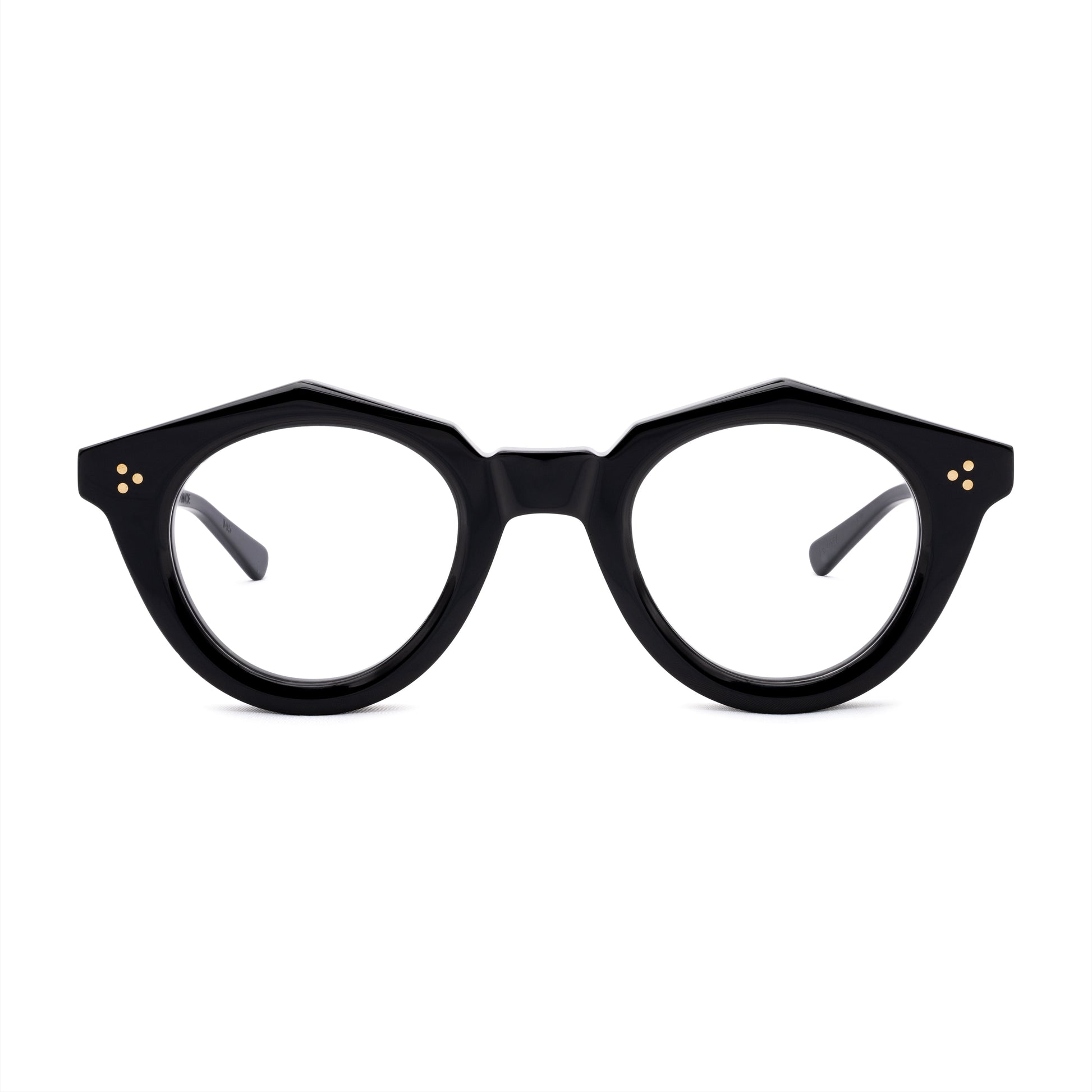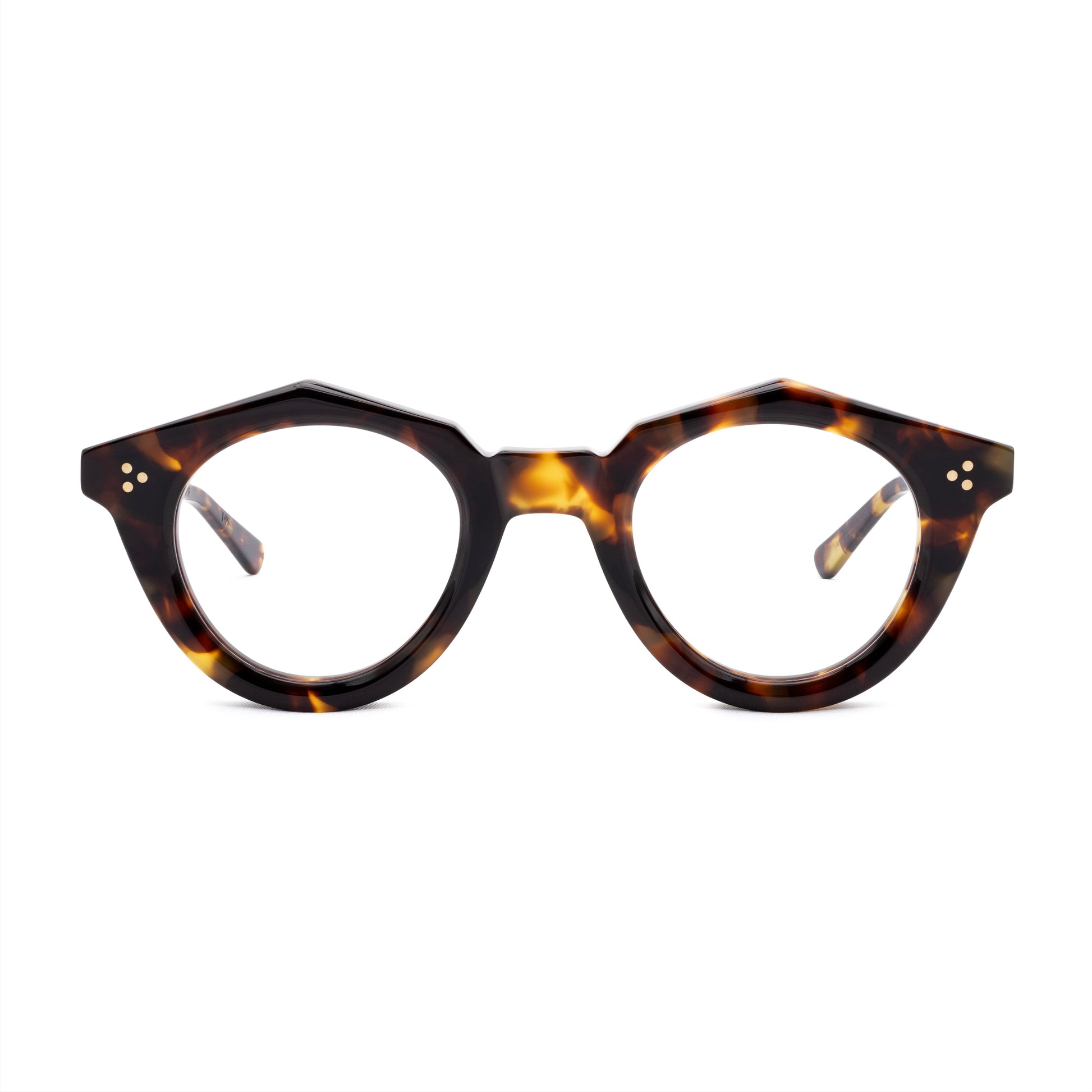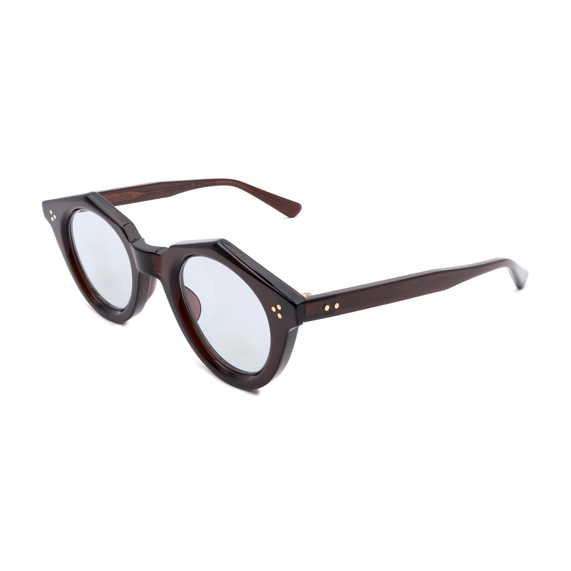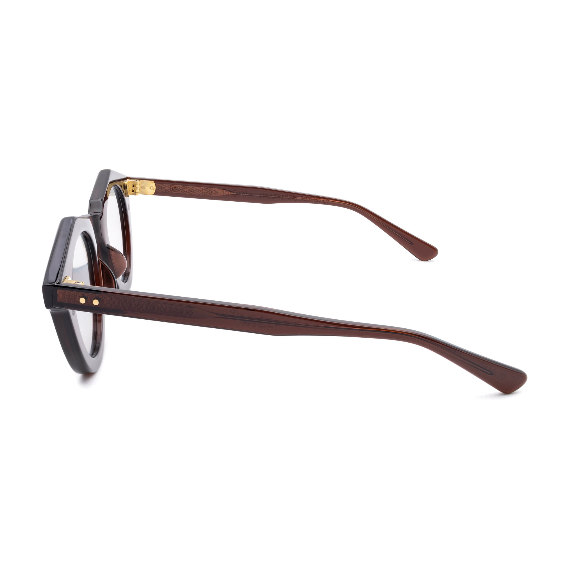 THE BOTTOM RIM IS ROUNDED WITH SKIVING AND A DEEP TV CUT.THE FRONT IS TRIPLE RIVETED WITH BRASS PINS, THE SIDE HORIZONTAL DOUBLE PINS. A HEAVY 5-BARREL BRASS HINGE IS THE CONNECTIVE ACTION OF THE FRAME. THE TEMPLE SHAPE MOVES BACK STRAIGHT AND ARTICULATES DOWN JUST BEFORE THE EAR AREA THEN ENDS IN AN UPLIFTED SQUARE ROUND TIP. SIZE 46□26-145