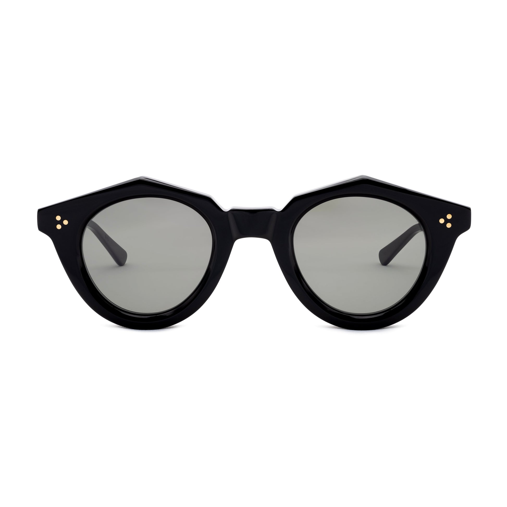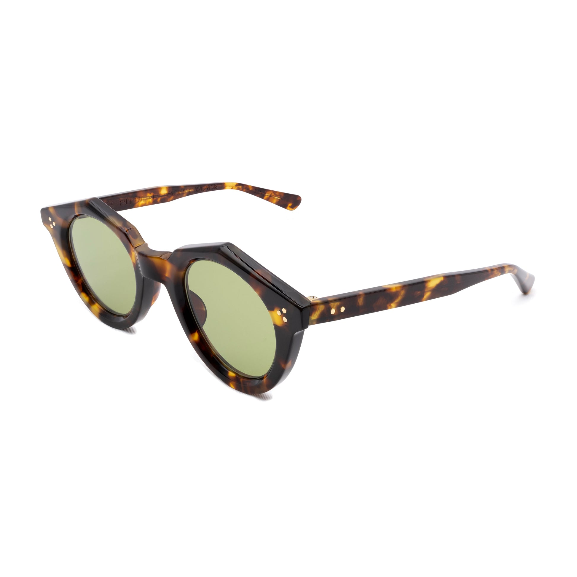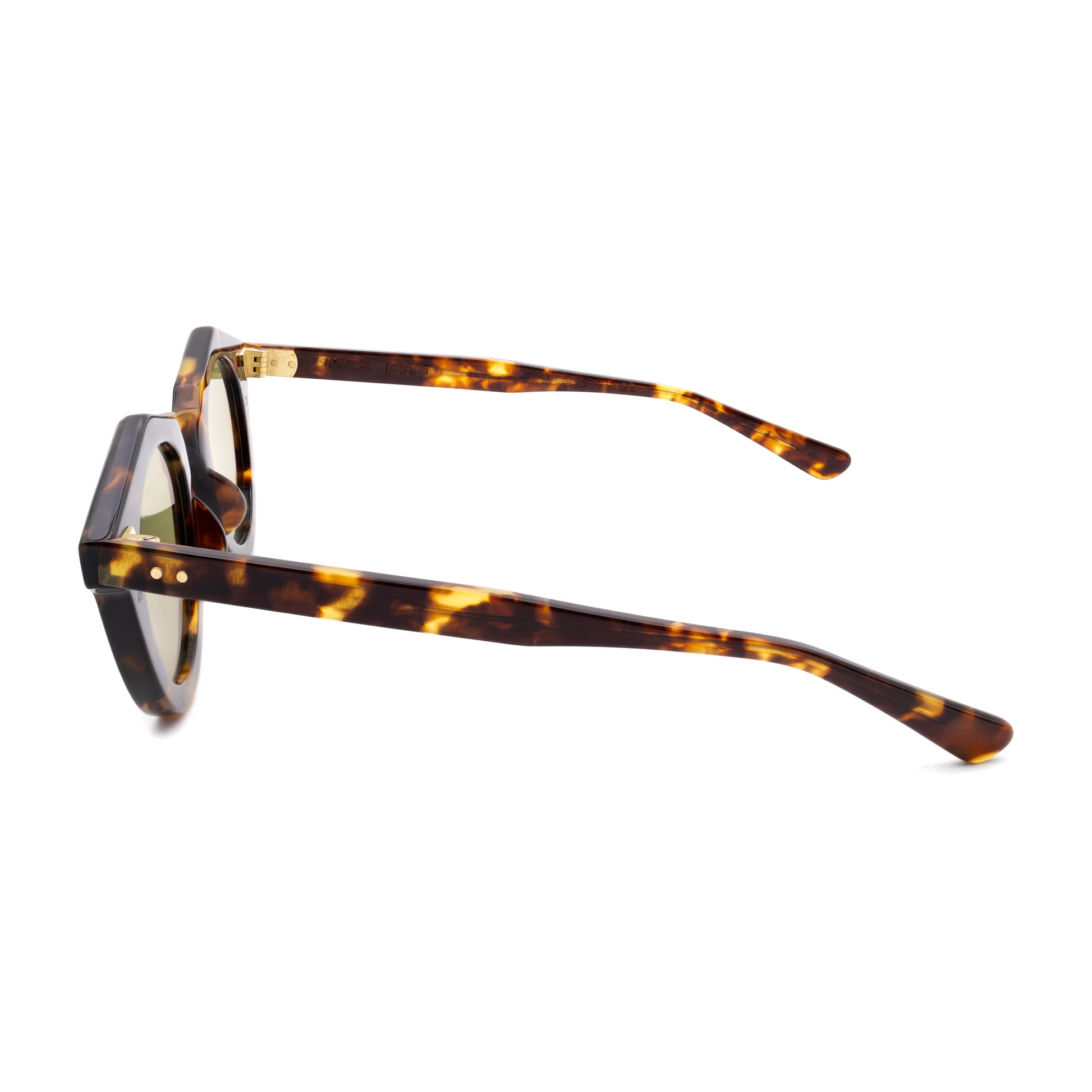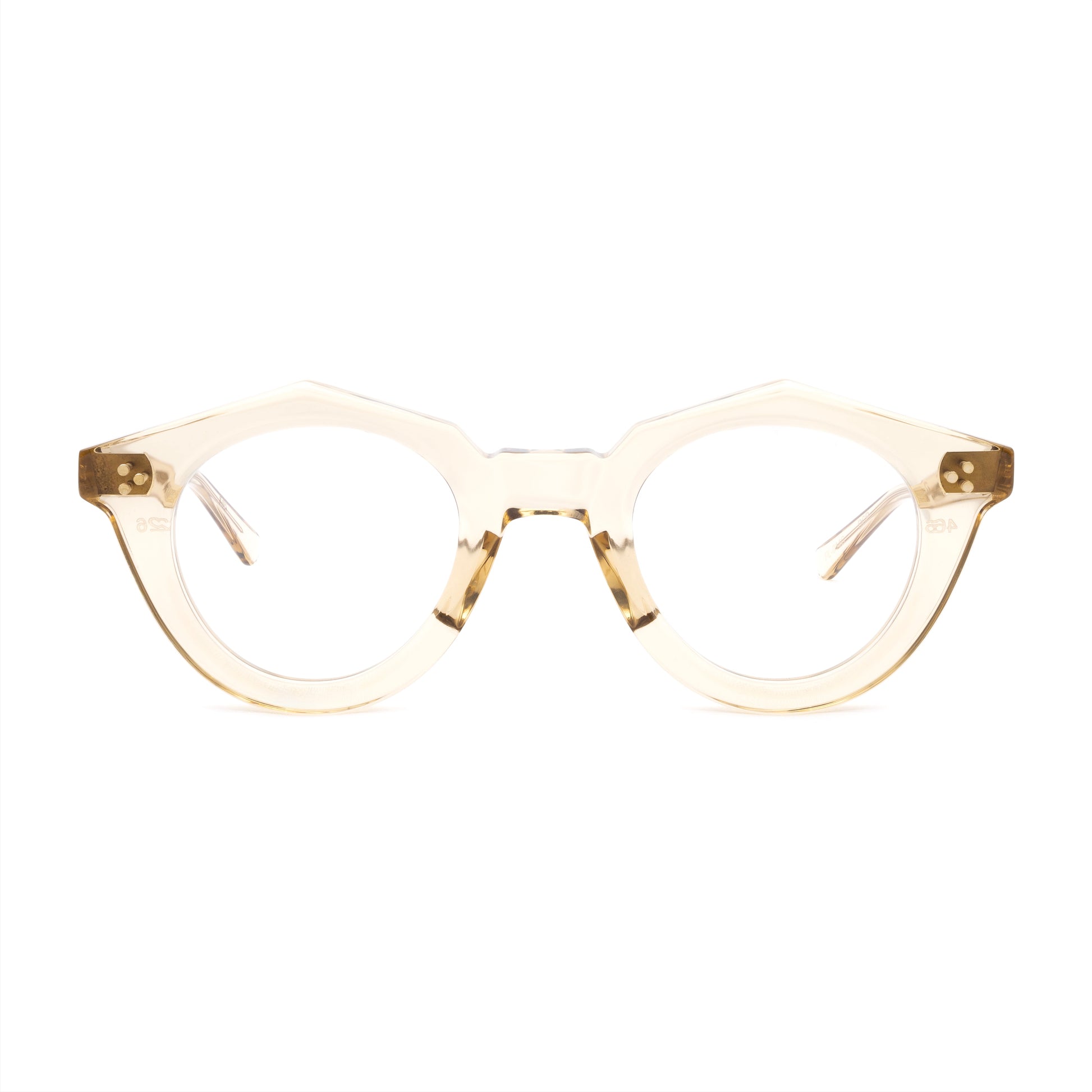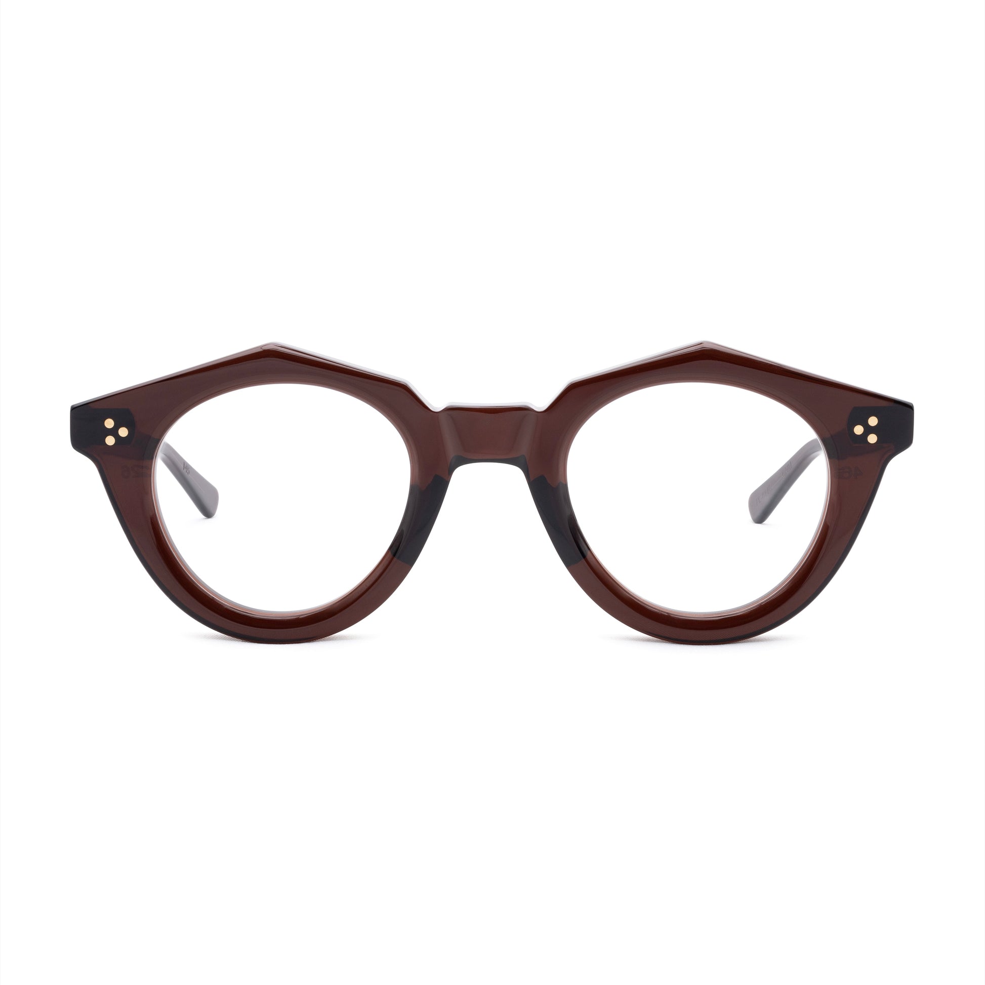 THE BOTTOM RIM IS ROUNDED WITH SKIVING AND A DEEP TV CUT.THE FRONT IS TRIPLE RIVETED WITH BRASS PINS, THE SIDE HORIZONTAL DOUBLE PINS. A HEAVY 5-BARREL BRASS HINGE IS THE CONNECTIVE ACTION OF THE FRAME. THE TEMPLE SHAPE MOVES BACK STRAIGHT AND ARTICULATES DOWN JUST BEFORE THE EAR AREA THEN ENDS IN AN UPLIFTED SQUARE ROUND TIP. SIZE 46□26-145