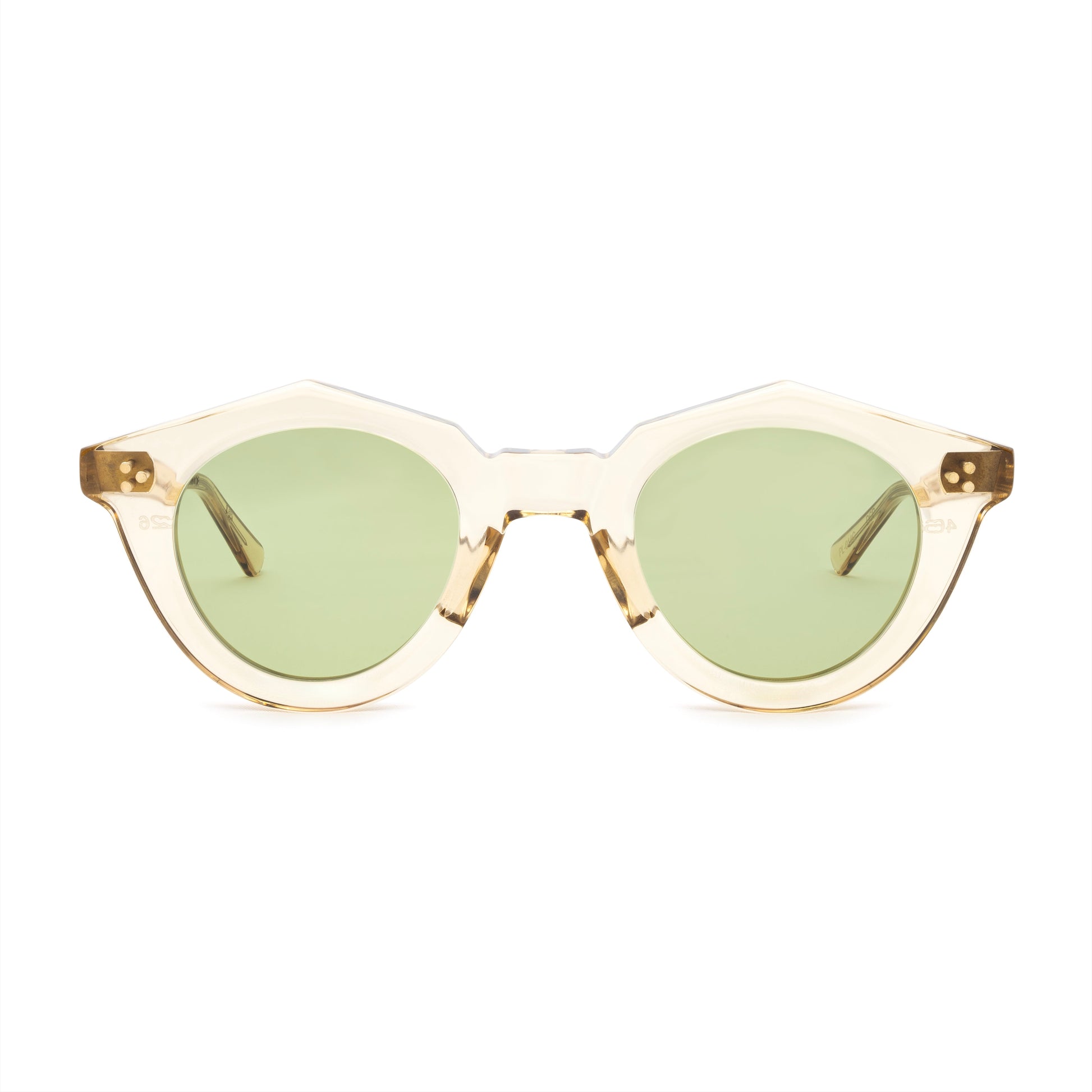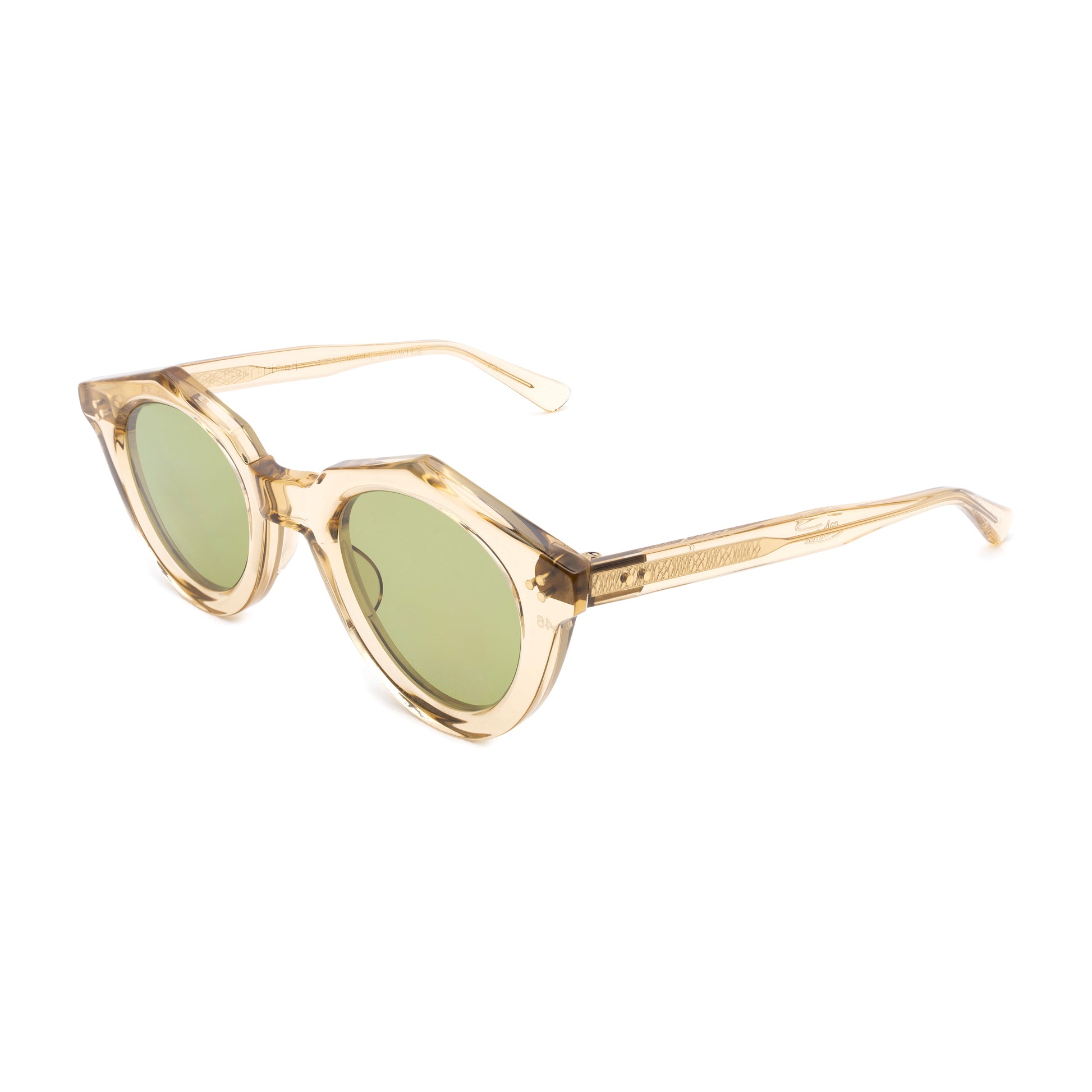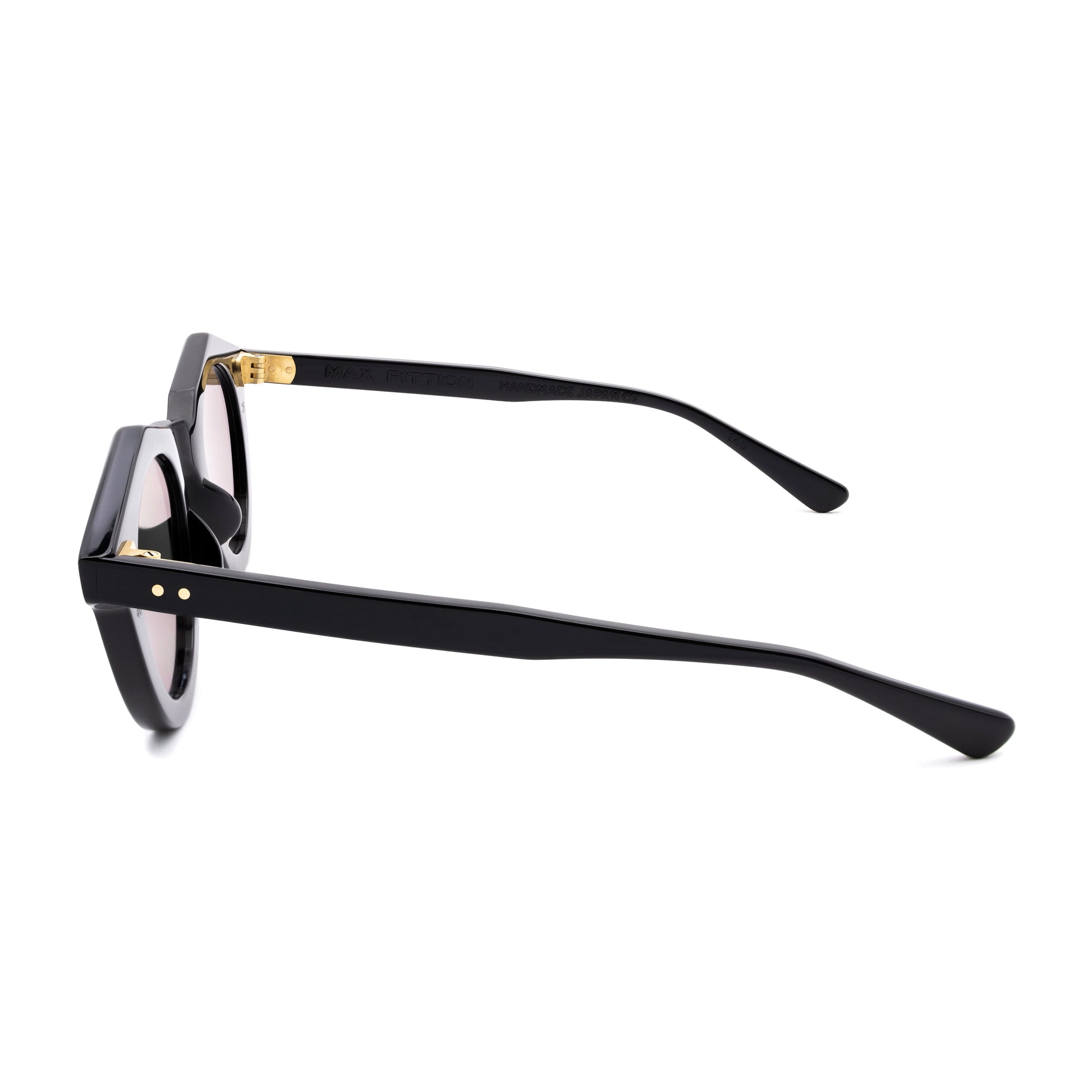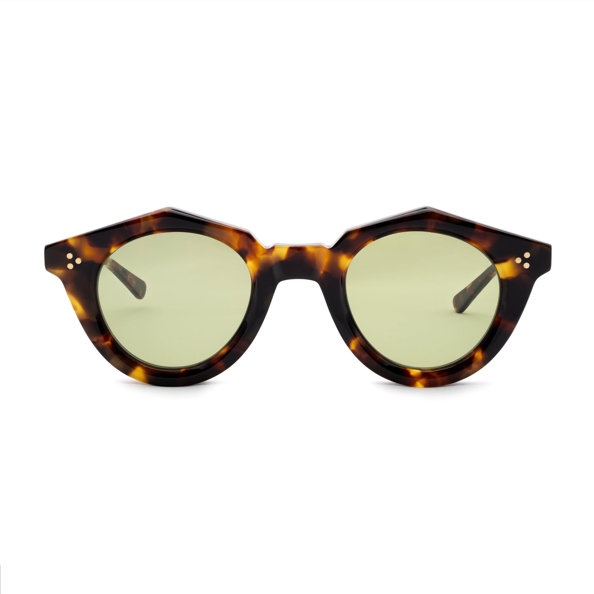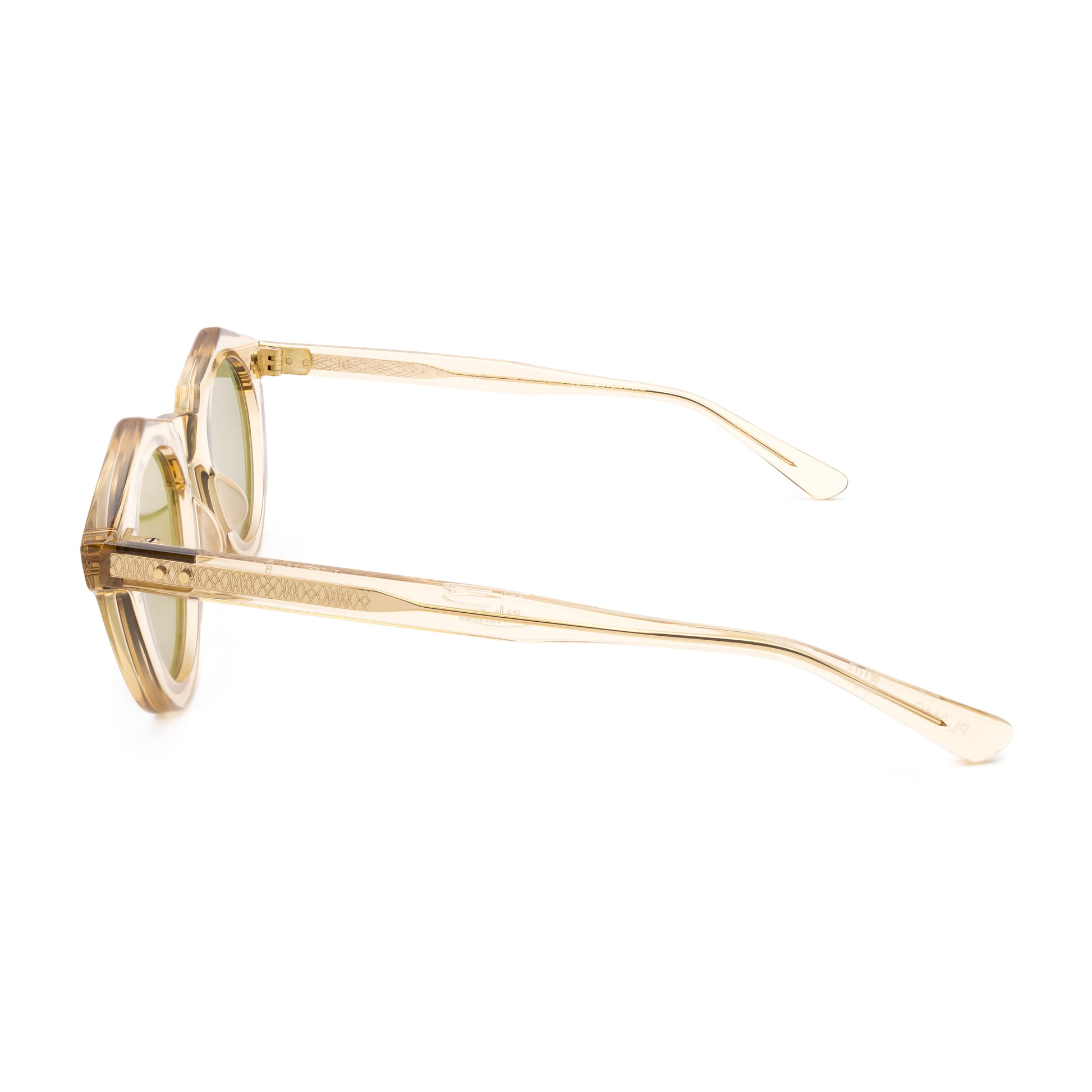 THE BOTTOM RIM IS ROUNDED WITH SKIVING AND A DEEP TV CUT.THE FRONT IS TRIPLE RIVETED WITH BRASS PINS, THE SIDE HORIZONTAL DOUBLE PINS. A HEAVY 5-BARREL BRASS HINGE IS THE CONNECTIVE ACTION OF THE FRAME. THE TEMPLE SHAPE MOVES BACK STRAIGHT AND ARTICULATES DOWN JUST BEFORE THE EAR AREA THEN ENDS IN AN UPLIFTED SQUARE ROUND TIP. SIZE 46□26-145
